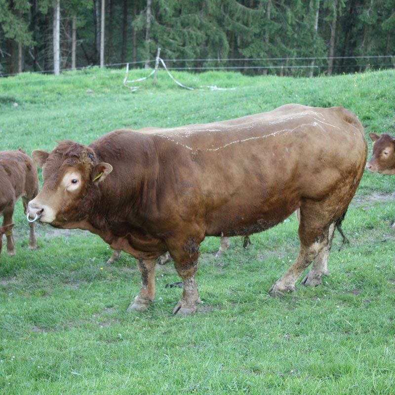 Zur Zeit haben wir eine Limousin- Mutterkuhherde von rund 40 Mutterkühen mit Kälbern, drei Deckbullen und Nachzucht, also insgesamt ca. 90 Tiere. Limousin-Rinder (Fleischrinderrasse) wurden ursprünglich in der Region Limousin im Herzen von Frankreich als Zug- und Mastrind gezüchtet. Mehr zu dieser Rasse finden Sie hier.